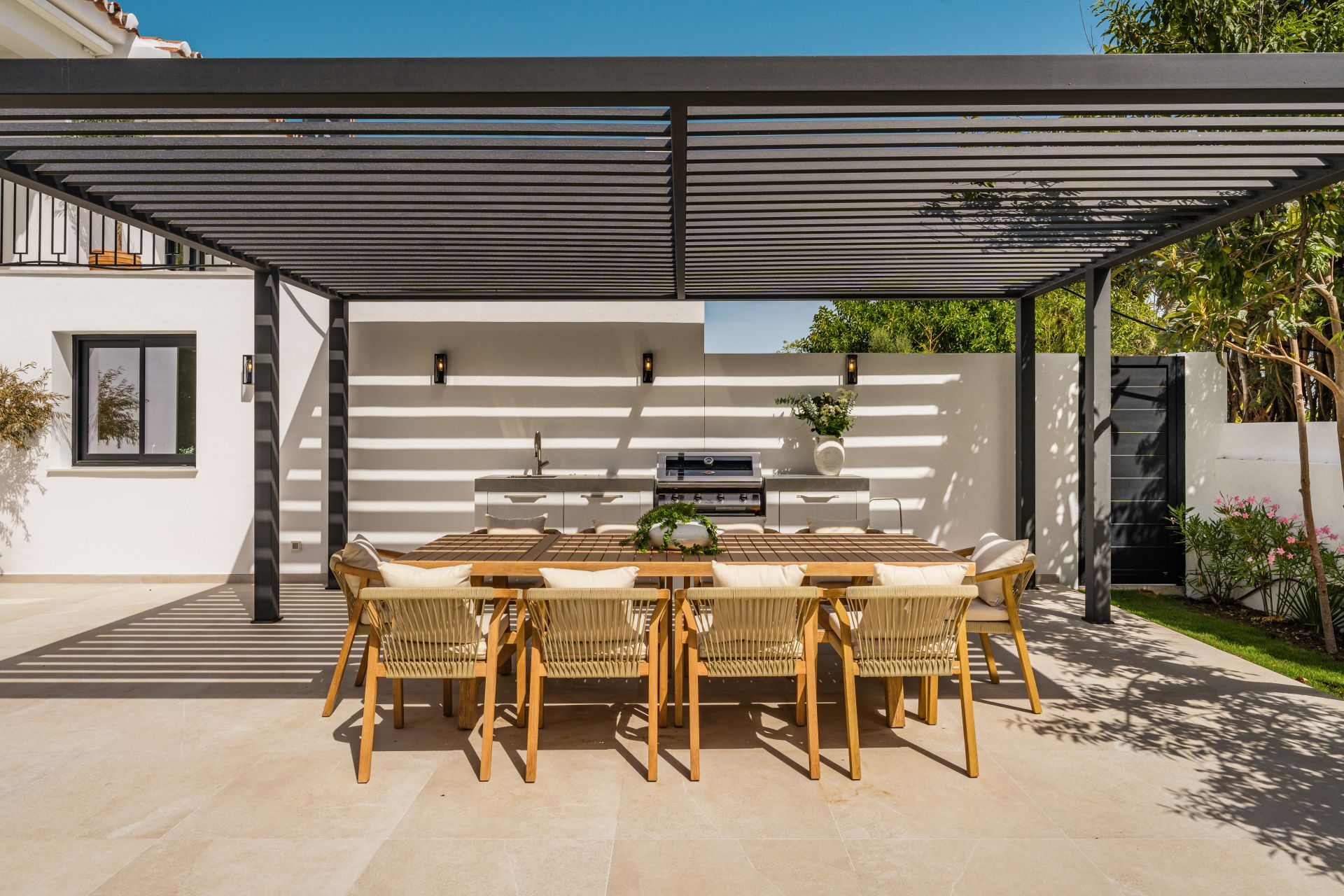 Security and functionality are integrated throughout the property. Security shutters, a gated entrance, and a private garage. The villa is offered fully furnished, echoing the minimalist yet luxurious aesthetic that defines every room, making it move-in ready.